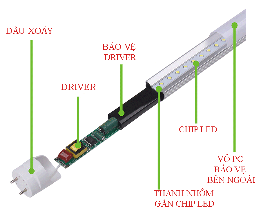 CẤU TẠO CỦA LED TUBE đơn giản gồm các bộ phận: